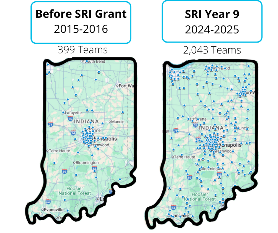 Prior to the State Robotics Initiative, Indiana had 73 elementary, 156 middle school, and 170 High School VEX teams. We are proud to say that 6 years after launching the SRI, our state can boast an impressive 952 elementary, 491 middle school, and 237 high school VEX teams!